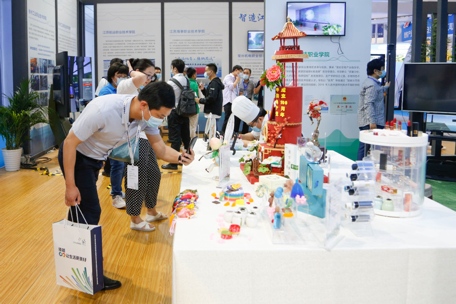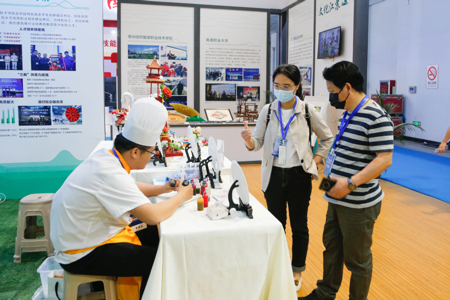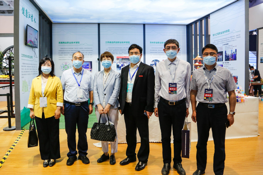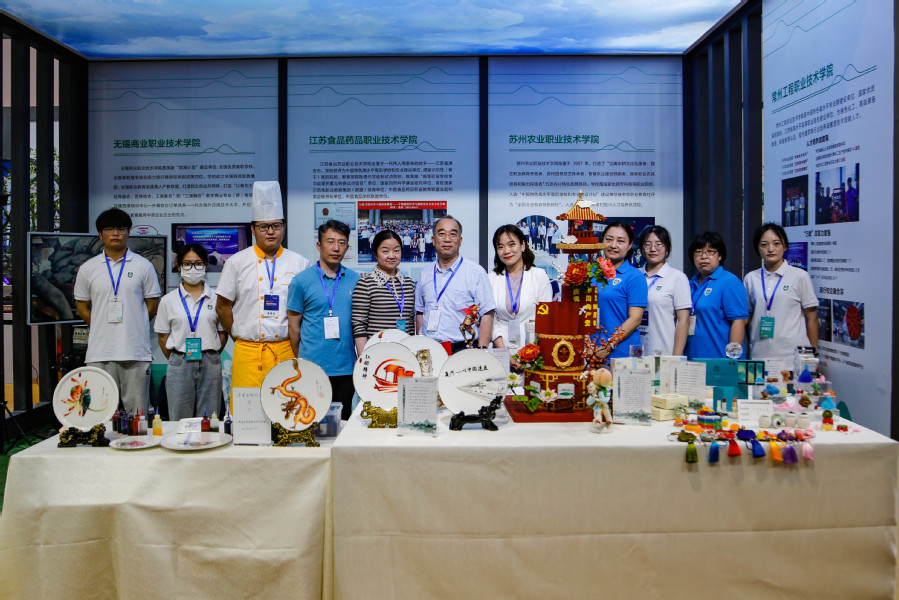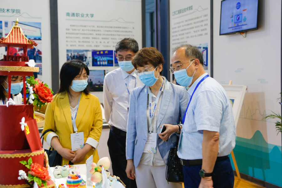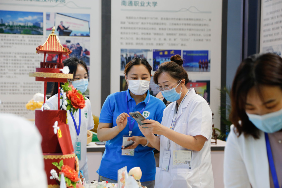 经过前期省内高校技能展示项目比拼,学校药妆、中药茶饮、面塑、果酱画等技能脱颖而出,于江苏馆核心位置展示,在启动仪式当日吸引了众多高校专家、各教育厅领导、师生等驻足欣赏、合影、留念。来自山东省教育厅的两位领导在药妆展示台前咨询,大力称赞我校创新创业工作;各省属高职校专业教师纷纷在周干老师果酱画展示台前驻足,领略传统技艺、感叹卓越技能、称赞校园美育。同时,学校还通过图片、文字、讲解、操作等,集中展示了学校在加快建设职业教育创新发展高地,立足新发展阶段、贯彻新发展理念、服务国家大健康发展格局的积极作为和创新实例。