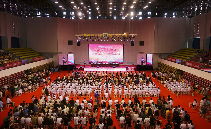 暖风轻拂,乐曲飞扬。6月9日上午,江苏食品药品职业技术学院2021届毕业典礼在大学生活动中心盛大举行。校领导陶书中、冯锋、戴光顺、翟玮玮、张建华、沈艾林、安进,党委委员周耀明、张军及各二级院部行政负责人在主席台就座,2800余名毕业生与家长、校友、教职工线上线下欢聚一堂,共同见证学子们完成学业开启人生新征程的重要时刻。典礼由副校长翟玮玮主持。