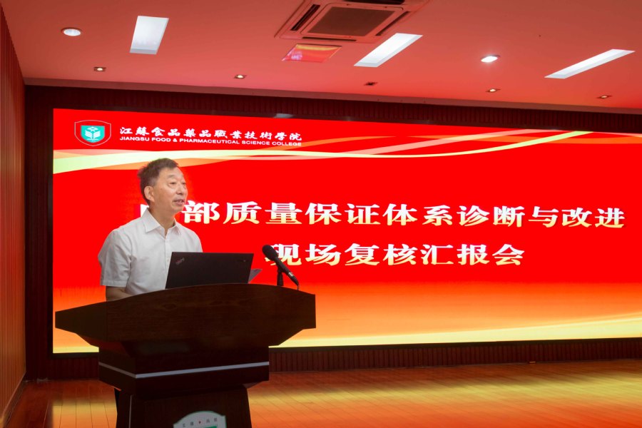 江苏省高等教育学会秘书长吴立保代表江苏省教育厅、省高教学会讲话。他表示,江苏食品药品职业技术学院在党委行政领导班子的带领下、全院师生员工的努力实现了令人印象深刻的跨越式发展,希望江苏食品药品职业技术学院提高政治站位、达成高度共识,同心同德做好本次复核工作。