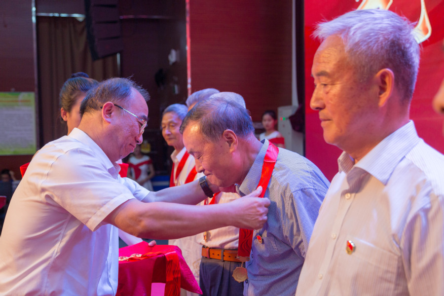 ▲党委书记陶书中为老党员戴纪念章
