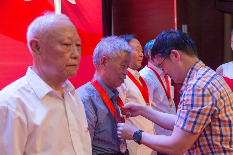 ▲校长冯锋为老党员戴纪念章