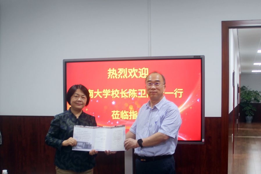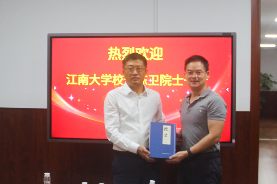 陶书中代表学校对陈卫院士一行的莅临表示热烈欢迎,并简要介绍了我校近年来的发展概况、内涵建设及服务地方经济社会发展等情况。陈卫院士对我校的热情接待表示感谢。他说,自己曾在江苏食品药品职业技术学院工作过4年,与我校有着深厚的渊源和感情,也时常关注学校的发展和动态,现在在校工作的很多老师都是他的老同事。近年来学校的建设发展有目共睹,他非常高兴看到学校日新月异的变化,希望今后能为学校的发展贡献力量,同时也希望学校能进一步彰显教育特色,为淮安聚焦打造“绿色高地、枢纽新城”,全面建设长三角北部现代化中心城市贡献苏食药院智慧和力量。我校还向陈卫院士及其夫人赠送了他们入职我校时的工作介绍信复印件及我校编撰的校史等珍贵资料。