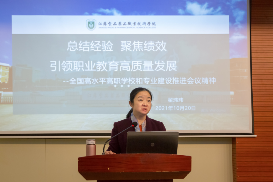 会上,副校长翟玮玮首先以《总结经验,聚焦绩效,引领职业教育高质量发展--全国高水平高职学校和专业建设推进会议精神》为题,就9月27日在北京召开的高水平高职学校和专业建设推进会会议精神作了传达和分享,并重点从加强党的核心领导作用,做好双高顶层设计;打造高水平专业群,培养技术技能人才;打造技术技能创新服务平台,提升服务发展水平;打造高水平双师队伍;提升校企合作水平;提升学校治理水平;提升国际化水平;加强双高建设绩效管理等八个方面作了创新做法的凝练和总结。翟玮玮认为,学校要着力优化外部环境,积极争取地方政府全力支持、加大与外部政行企的深度合作;要着力深化内部治理,加大体制机制创新,改革措施要有效落地,要加大奖优罚劣力度;要着力强化项目攻坚,项目建设办公室要做好重点工程的顶层规划,明确责任,定期研讨,检查推进;各部门要提前做好2022年工作任务设计,打好重点项目攻坚战,多部门协同开展工作。最后,翟玮玮希望各部门、每位教职工,都能有想法、有真干、有实效,有所作为才是硬道。