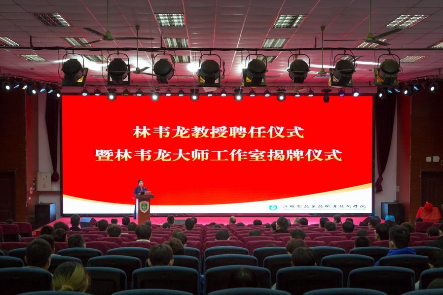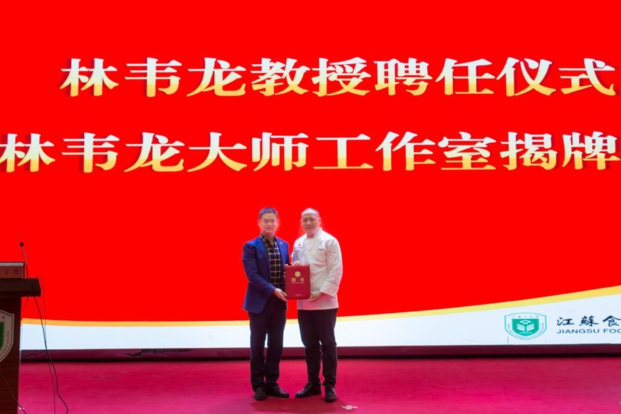 冯锋为林韦龙大师颁发了江苏食品药品职业技术学院兼职教授聘书,陶书中为林韦龙大师工作室揭牌。