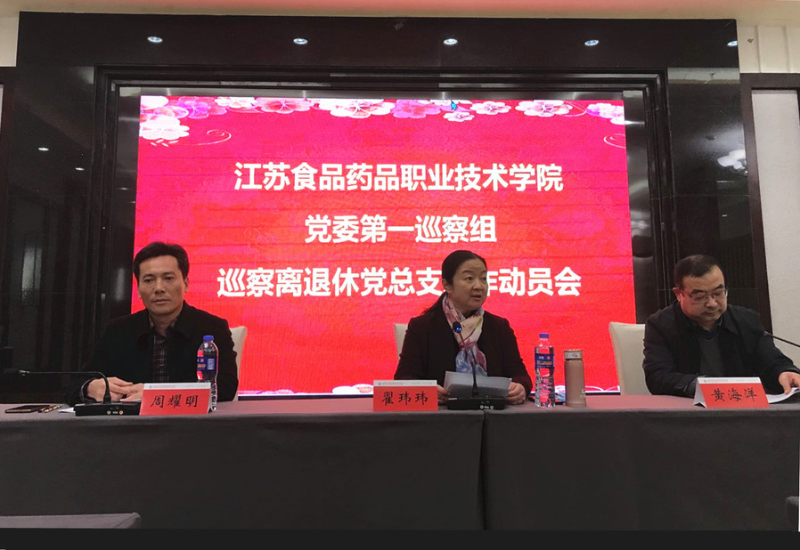 11月9日下午,党委第一巡察组巡察离退休党总支工作动员会在淮安市迎宾馆二楼召开。党委第一巡察组组长翟玮玮、副组长周耀明等巡察组全体成员出席了会议。会议由离退休党总支书记黄海洋主持,离退休党总支领导班子成员、部分离退休老同志和全体在职教职工参加了会议。会上,翟玮玮代表第一巡察组作巡察进驻动员讲话,她指出本次巡察是对离退休党总支的“政治体检”,重点巡察总支在“四个落实”方面存在的问题,她希望离退休党总支高度重视、敢于担当,切实增强接受巡察监督的自觉性和坚定性,确保巡察工作顺利开展,取得实效。黄海洋做表态发言,他表示全体班子成员将严格贯彻落实巡察组要求、积极配合做好巡察工作。