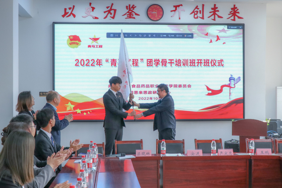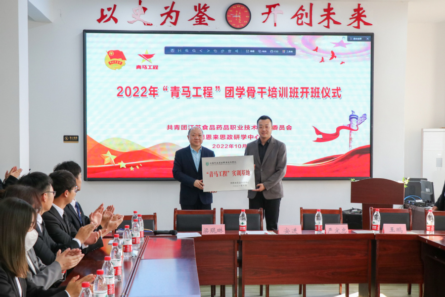 在深入学习贯彻“党的二十大报告精神”,朝着第二个百年奋斗目标奋勇前进之际,10月28日,2022年江苏食品药品职业技术学院“青马工程”培训班开班,开班仪式及当日课程在周恩来思政研学中心举行。江苏食品药品职业技术学院副校长安进、周恩来纪念馆副馆长严定忠、周恩来思政研学中心主任王鹏、江苏食品药品职业技术学院团委副书记梁琨琳、周恩来思政研学中心副主任董文、各二级学院团总支书记及部分学员代表参加了开班仪式。