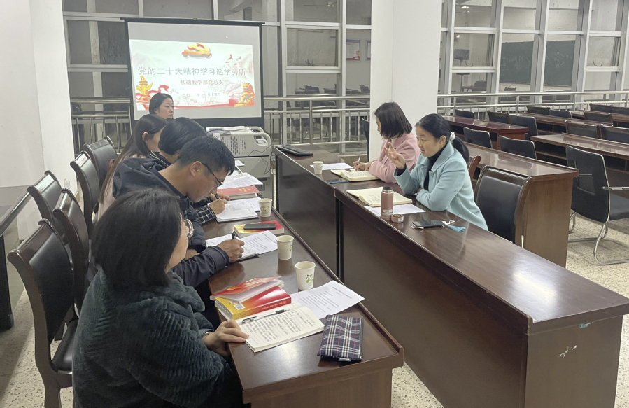 在基础教学部会议室,刘晓娟阐述了党的二十大党章修正案的重大意义和重要内容;房亚群、李文生分别领学了“如何理解教育科技人才是国家的基础性战略性支撑”以及“如何理解培养什么人、怎样培养人、为谁培养人是教育的根本问题”;党总支成员分别结合自身工作实际交流了学习体会。