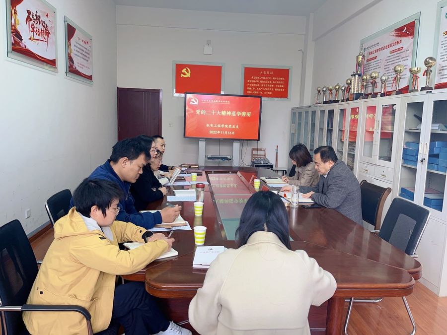 在机电工程学院会议室,机电工程学院党总支副书记张丽萍作学习贯彻党的二十大精神的党课报告。聚焦“如何理解培养什么人、怎样培养人、为谁培养人是教育的根本问题”和“如何理解坚持制度治党、依规治党”两个方面内容进行了重点领学。同时,围绕“三个务必”交流学习体会。理论学习组其他同志结合学习主题,联系自身工作分别作了交流发言。