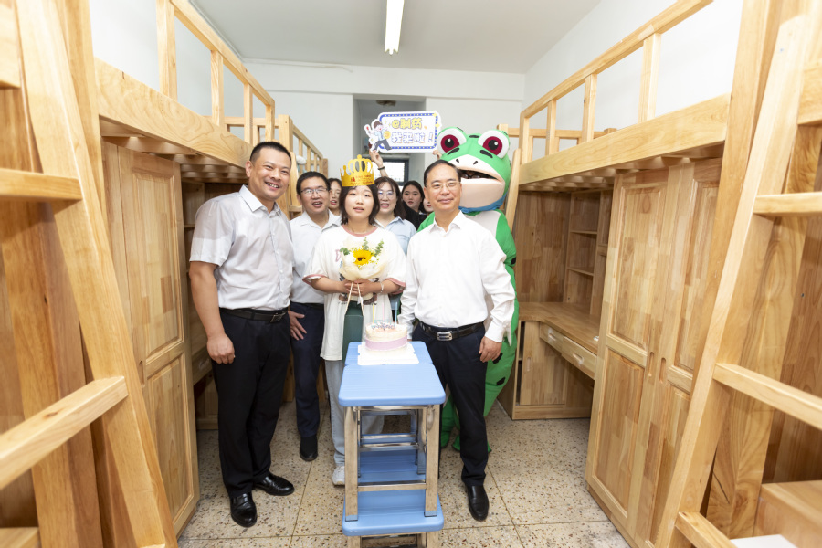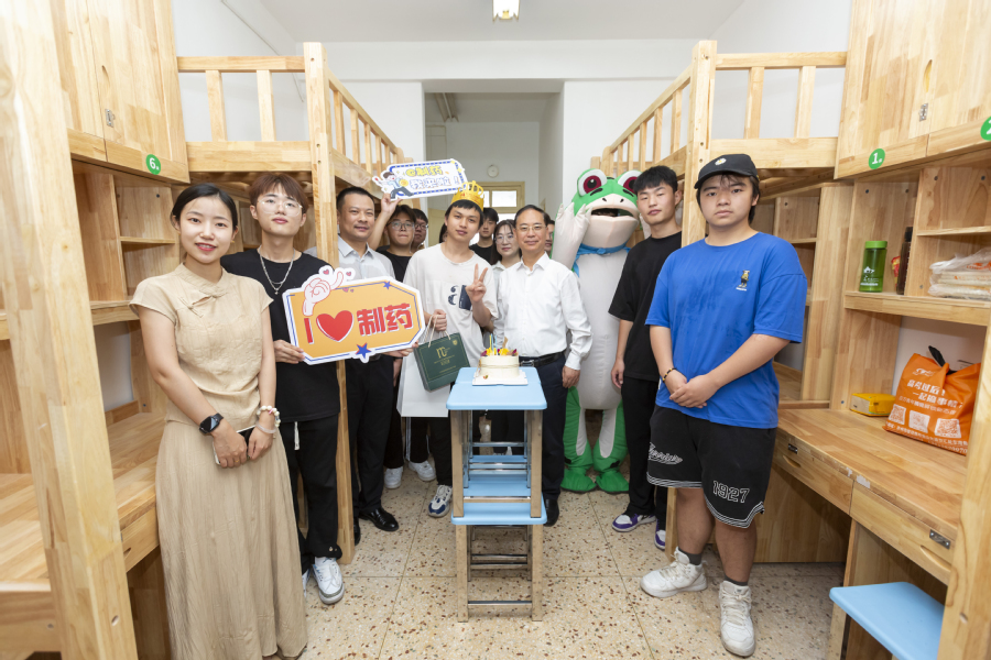 制药工程学院身穿民族服饰的学长学姐跳起了民族舞欢迎学弟学妹们,新生中有两名同学在报到当天迎来生日,学院为他们精心准备了生日蛋糕、贺卡和礼物。