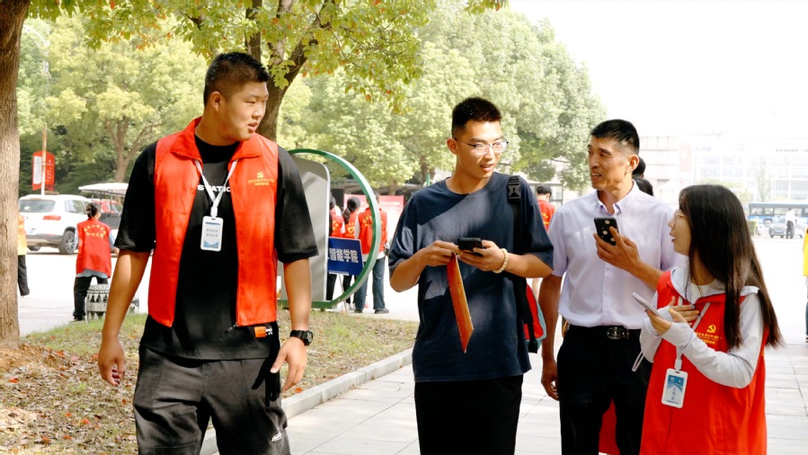 在学校穿梭忙碌的志愿者们依然是今年迎新现场一道靓丽风景线,他们身穿志愿者马甲坚守在各自岗位,行李搬运、秩序维护、校园引导、答疑解惑,用热情、细致、周到的服务温暖着每位新生的心。“一进校门就感受到了学长学姐的热情欢迎,大家都很友好善良,减轻了原本的紧张。” 护理专业新生张茹轩说。“很放心,学校氛围也很好。感谢领导老师对孩子的重视和关心,希望孩子能在这里学到知识,交到朋友,在专业上发光发亮。” 张茹轩家长说。