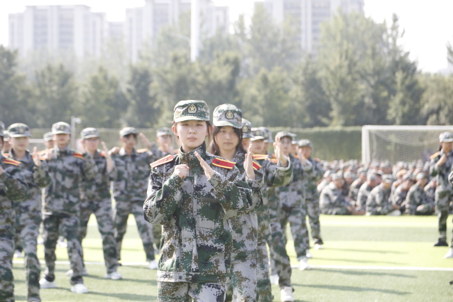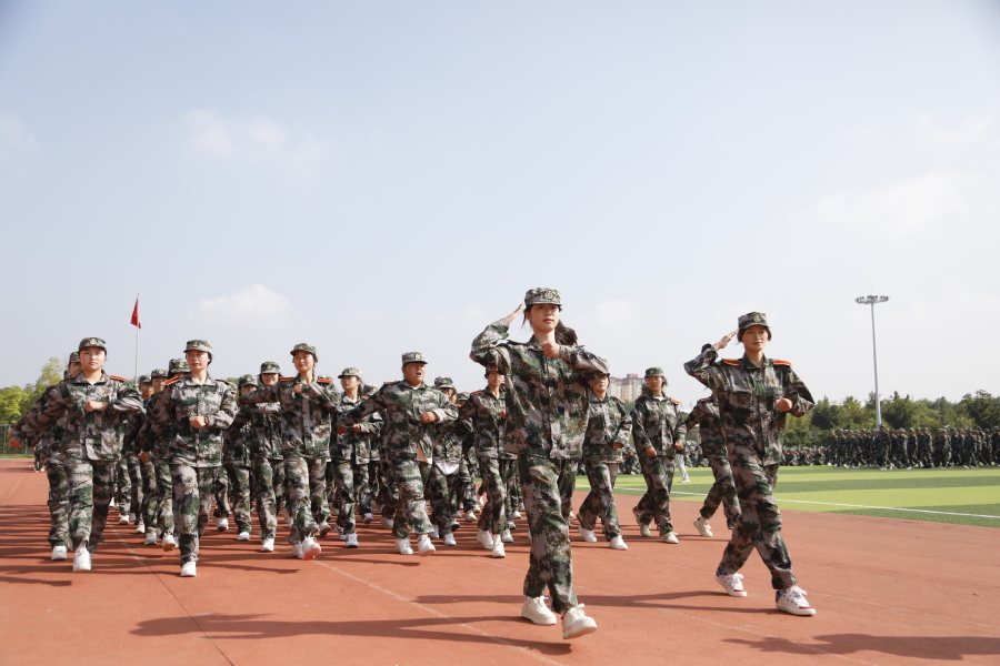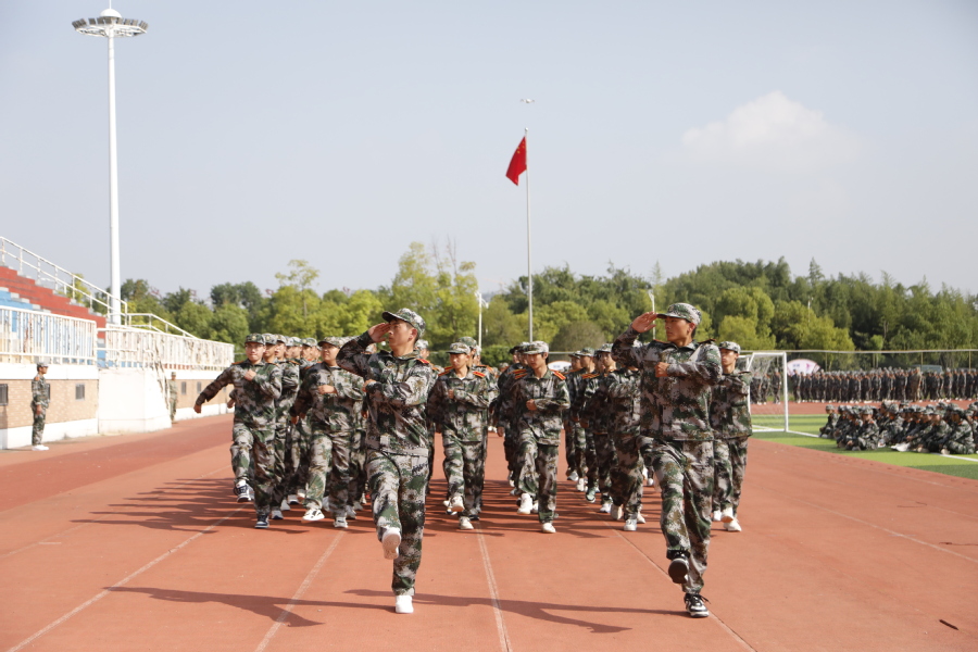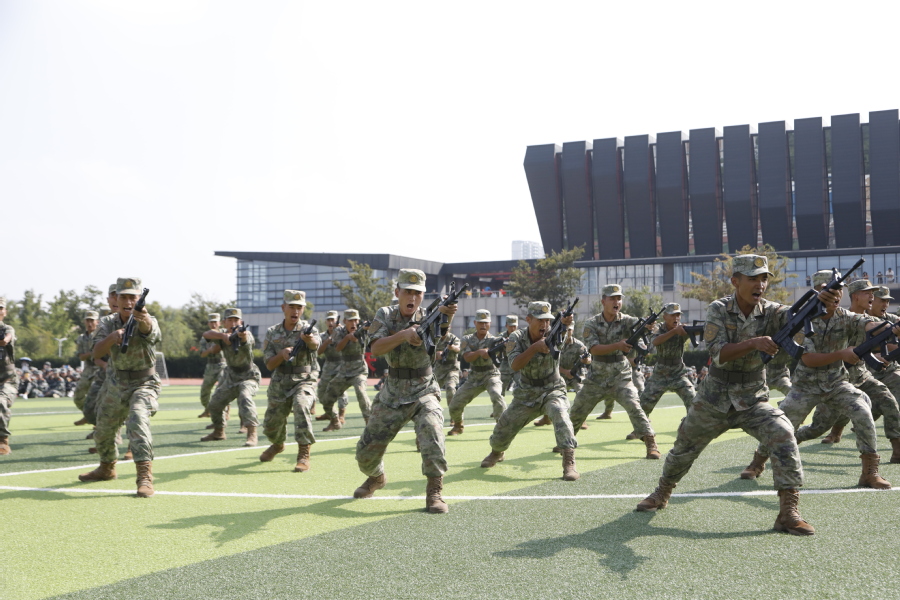 国歌奏响,国旗飘扬,大会在雄壮的国歌声中拉开序幕。“请党放心、强军有我”表演方阵勾勒出“以人为本、立德尚能”的校训;分列式列整齐划一,精神昂扬饱满,充分展现了我校学子朝气蓬勃、积极向上的精神面貌;格斗术一招一式有模有样,拳头落得有力,脚步扎得踏实,打出了当代大学生的精神气魄;刺杀操杀声震天,尽显沙场豪情。