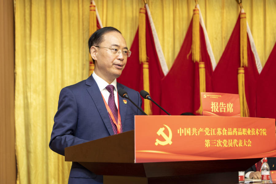 薛宇代表中共江苏食品药品职业技术学院第二届委员会作题为《奋楫笃行 勇立潮头 努力在高质量发展新征程中走在前做示范》的工作报告。薛宇在报告中全面总结了过去五年的主要工作和发展成就,深刻分析了学校发展新形势,提出下一阶段发展目标与思路,明确今后五年主要工作任务,强调以高质量党建引领推动事业高质量发展。