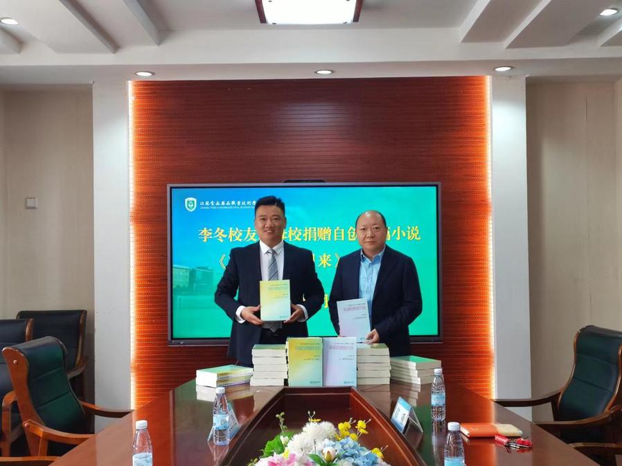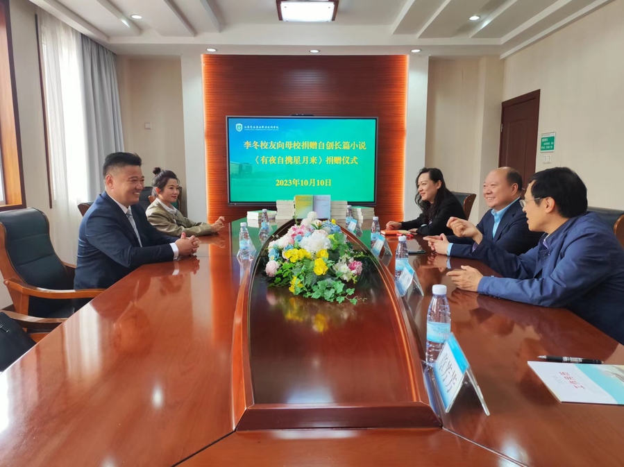李冬分享了自己在校时的求学经历及目前自创公司的发展情况。他表示,毕业后一直关注母校的发展,看到母校各项工作蒸蒸日上、社会认可度不断提高,倍感荣幸和自豪。李冬以自己在校期间的学习创业经历以及毕业后在商海打拼的历程为背景,写下了75万字的长篇小说《有夜自携星月来》,现捐赠20套书籍给母校。