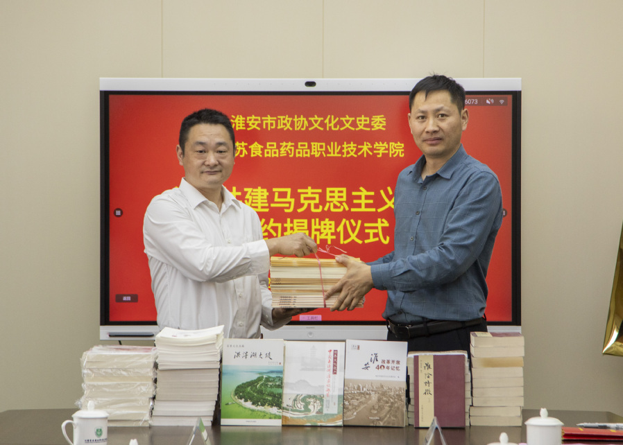 图书馆馆长姜海军代表我校接受市政协文化文史委向我校赠送的《淮安改革开放40年记忆》等淮安文化文史类书籍共计100套,后期,我校将在图书馆设立“政协文史书柜”。