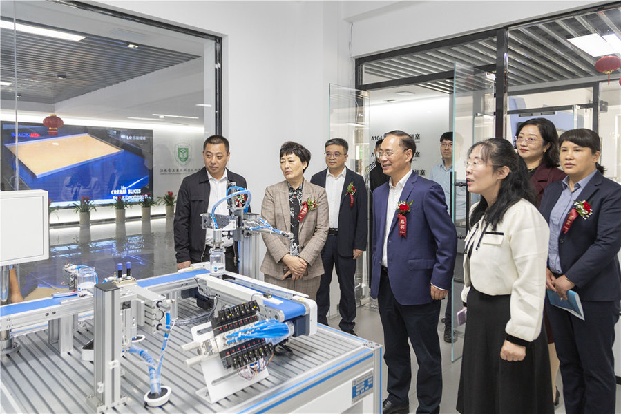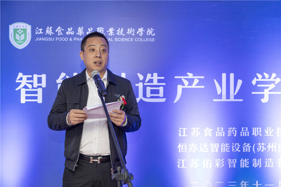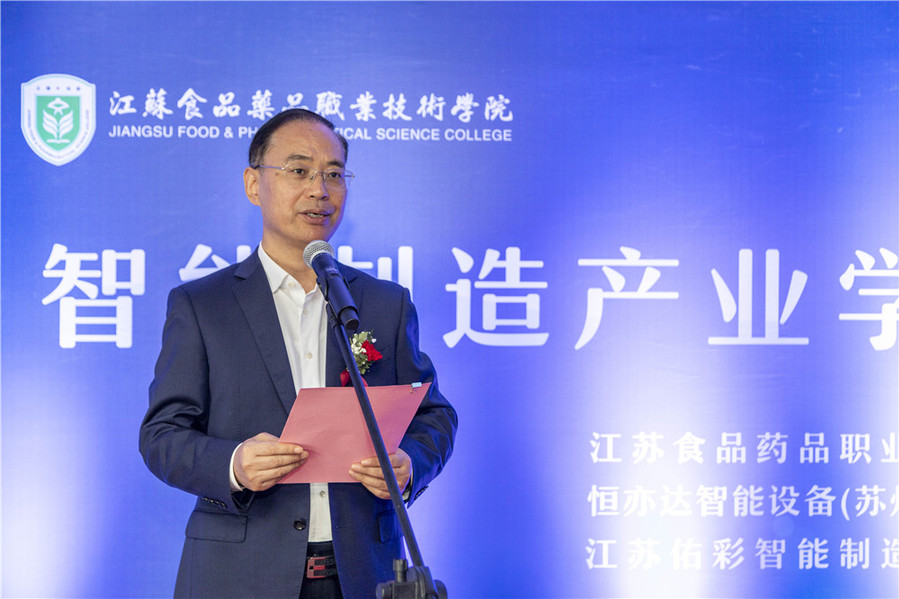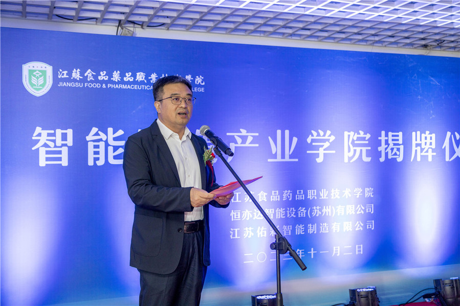 11月2日上午,江苏食品药品职业技术学院智能制造产业学院成立大会暨揭牌仪式在我校1号实验楼举行。学院由江苏食品药品职业技术学院与恒亦达智能设备(苏州)有限公司、江苏佑彩智能制造有限公司合作共建。淮安经济技术开发区党工委委员、党群工作部部长(机关工委书记)、科教办党组书记、主任葛玉海,淮安市教育局副局长谷玉红,盐城知识产权协会会长赵华,恒亦达智能设备(苏州)有限公司、江苏佑彩智能制造有限公司董事长李清宇,校党委书记薛宇出席活动。揭牌仪式由副校长张军主持。