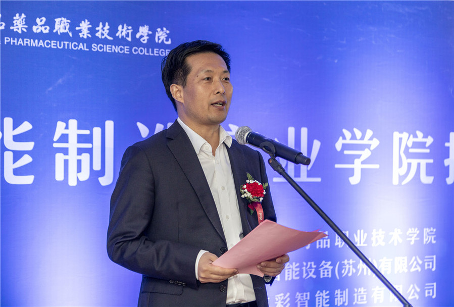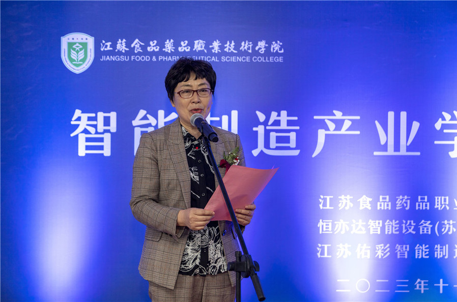 谷玉红代表淮安市委教育工委、淮安市教育局对产业学院的成立表示祝贺。她指出加快建设现代产业学院,是职业教育支撑地方经济高质量发展的必然要求,是推动分类发展、特色发展的重要举措。江苏食品药品职业技术学院主动融入淮安经济高质量发展大局,深入推动产教融合、校企合作,在现代产业学院建设上先行先试,为深化职业教育改革发展,提高淮安市相关制造产业竞争力和汇聚发展新动能提供了强有力的人才支持和智力支撑。