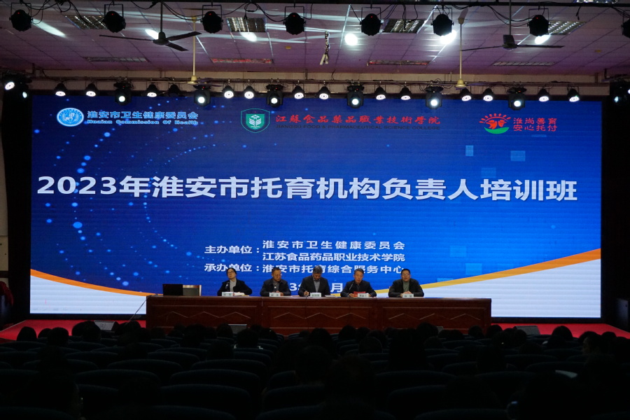 为进一步加强全市托育服务人才队伍建设,提升全市托育机构负责人办托理念,强化托育从业人员婴幼儿照护能力,11月25日,由淮安市卫生健康委员会和江苏食品药品职业技术学院联合主办、淮安市托育综合服务中心承办的2023年全市托育机构负责人培训班在我校举行。市卫健委副主任赵国强、我校副校长贾韶千、人口与家庭发展处处长张艳等出席开班仪式。