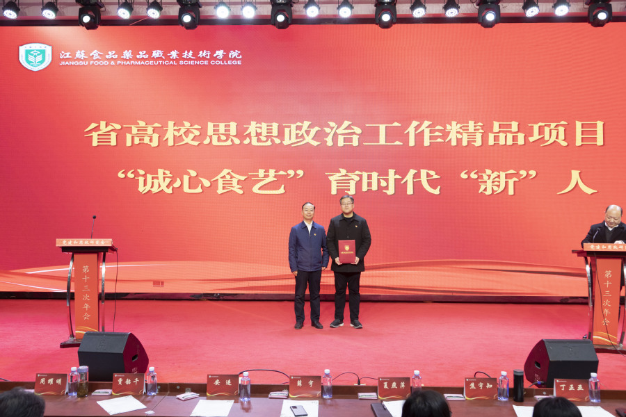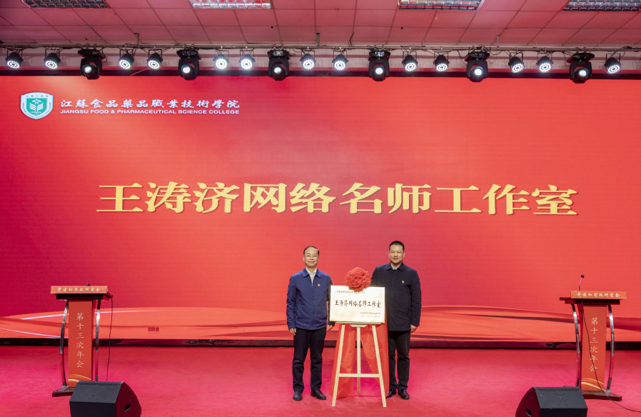 薛宇向网络名师工作室授牌,制药工程学院党总支书记王涛济接受授牌。今年十月,王涛济入选江苏省级高校网络教育名师。