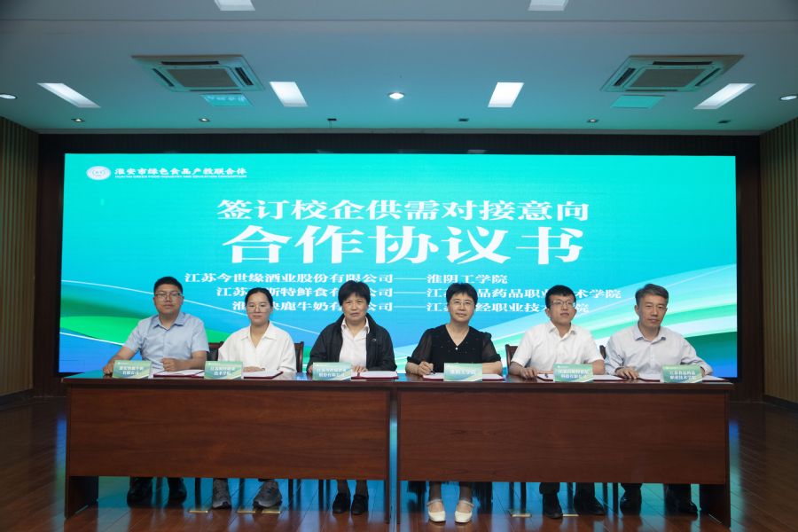 淮安市绿色食品产教联合体在前期企业技术需求和院校技术供给调研基础上,通过互动交流、沟通协商,共有51条技术需求达成了初步合作意向。本次大会上有3家代表企业与3家牵头院校签订了意向合作协议书,它们分别是江苏今世缘酒业股份有限公司、江苏百斯特鲜食有限公司、淮安快鹿牛奶有限公司和淮阴工学院、江苏食品药品职业技术学院、江苏财经职业技术学院。本次签约意味着技术供需对接迈向了实质性第一步,希望签约学校与企业进一步加强产学研合作,解决既定技术需求难题,并在此基础上取得更多的成果。