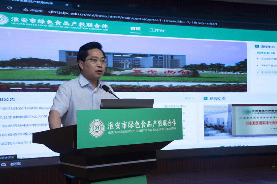 最后,淮安市绿色食品产教联合体副秘书长、江苏食品药品职业技术学院产教融合办公室主任於文刚进行了联合体智慧服务平台介绍和操作演示。