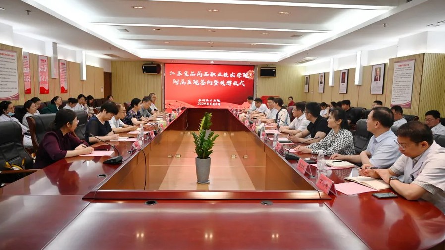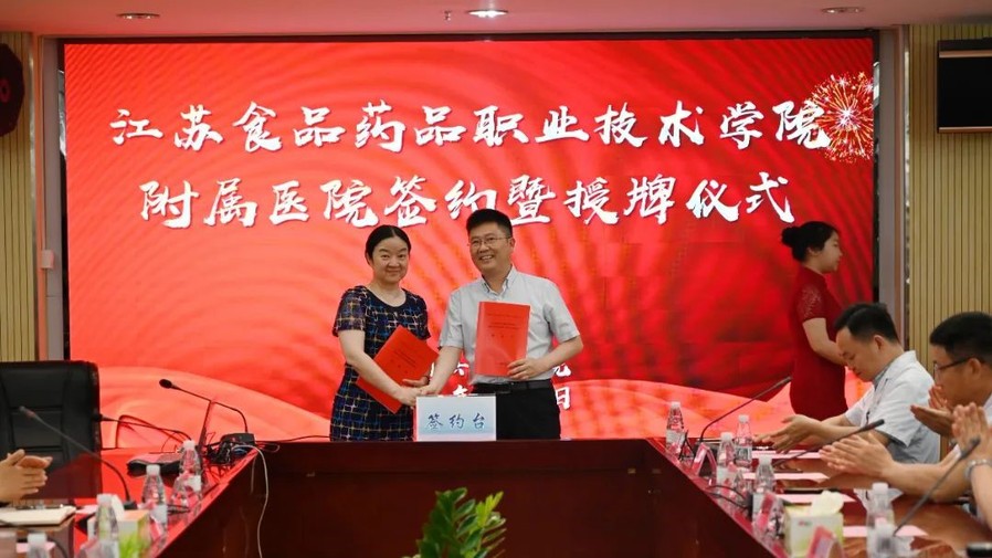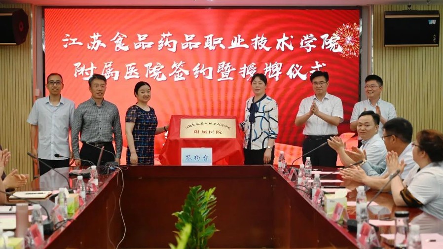 在出席人员的见证下,翟玮玮与陈松清签订了江苏食品药品职业技术学院与金湖县中医院合作协议,随后与会领导共同为“附属医院”揭牌。