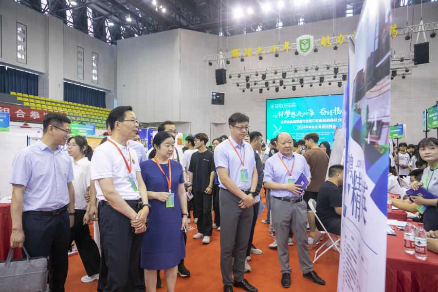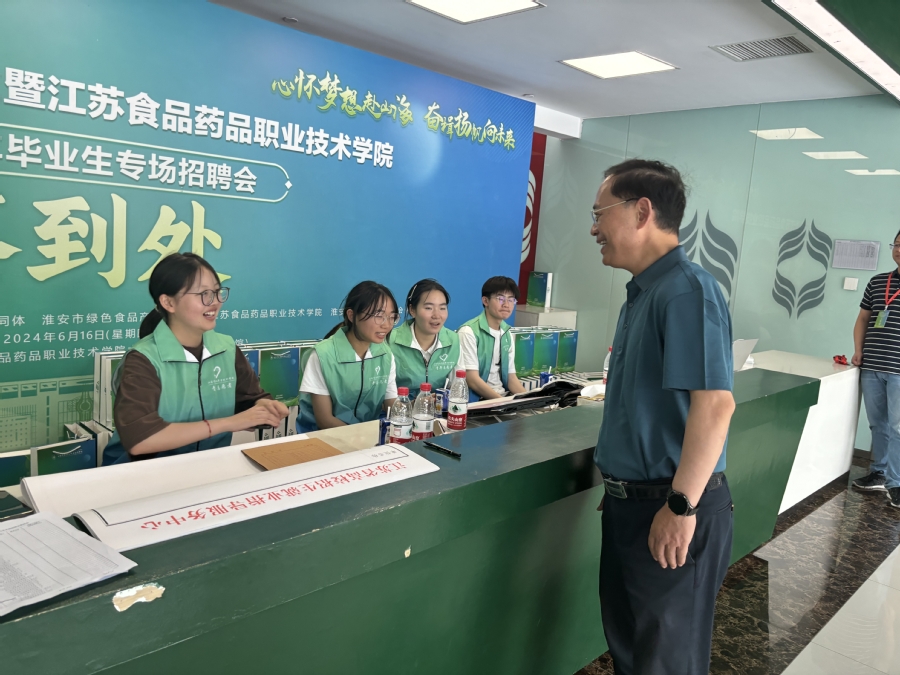 6月16日,江苏省食品药品行业暨江苏食品药品职业技术学院2024年毕业生专场招聘会在我校体育馆举行。此次招聘会由江苏省高校招生就业指导服务中心、中国食品产教融合共同体、淮安市人力资源和社会保障局和我校共同主办。江苏省高校招生就业指导服务中心副主任黄炜,淮安市人力资源和社会保障局局长曹曙春莅临现场,我校党委书记薛宇、校长翟玮玮、党委副书记安进、副校长贾韶千共同前往现场指导。市人社局、市人才中心相关领导陪同。