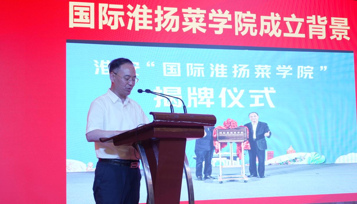 薛宇致欢迎词,他介绍了国际淮扬菜学院的成立背景,经世界中餐业联合会、淮安市人民政府、江苏省餐饮行业协会、江苏食品药品职业技术学院四方协商一致,于2022年合作共建国际淮扬菜学院。他表示,该学院成立以来在淮扬菜国际化人才培养、教学资源开发、烹饪技艺培训、美食文化推广和产品标准输出等方面成效显著,极大提升了学校人才培养与社会服务的知名度、美誉度和贡献度,擦亮了淮安“世界美食之都”金色名片。