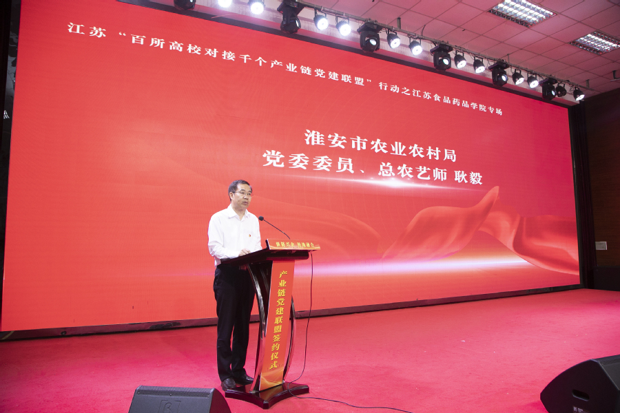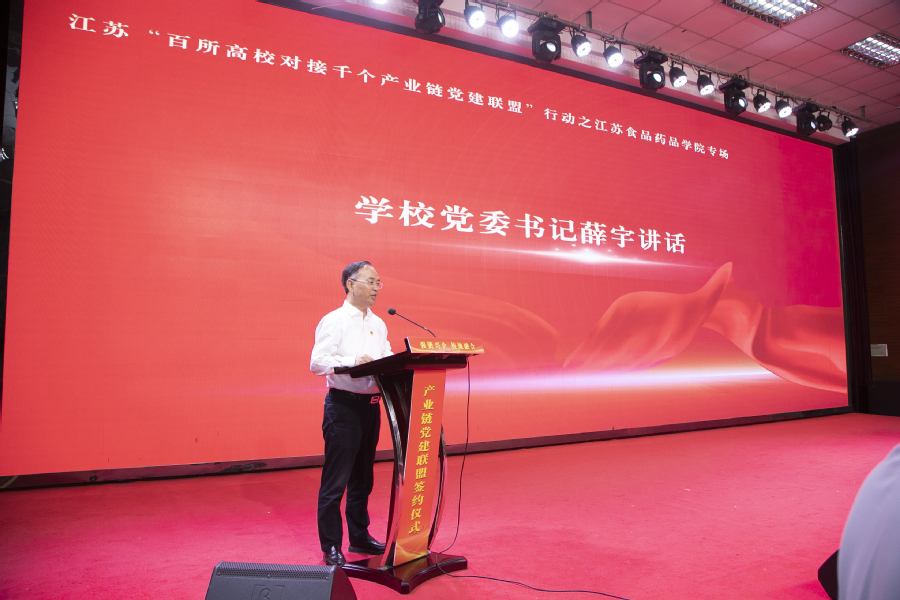 我校党委书记薛宇在讲话中对出席活动的领导、嘉宾表示诚挚的欢迎和衷心的感谢。他指出,学校作为办学在淮安、服务于淮安的国家“双高计划”建设单位,主动对接淮安市“7+3”产业,做优做强食品、药品和大健康专业群,主动对接产业链党建联盟(党委),着力推动党建链、专业链、产业链“三链融合”。薛宇强调,学校要从党建联盟高质量推进出发,围绕校企双方更好地实现合作共赢,一是要依托党建联盟,打造产教融合“红色引擎”;二是要做实党建联盟,深化产教融合“联动效应”;三是要优化党建联盟,构建产教融合“长效机制”。学校要和产业链联盟党委、相关共建单位主动对接、靠前服务,坚决做到工作务实、过程扎实、结果真实,确保各类签约项目落地生根、见行见效,以高质量党建引领学校人才培养质量提升和地方产业跨越发展。
