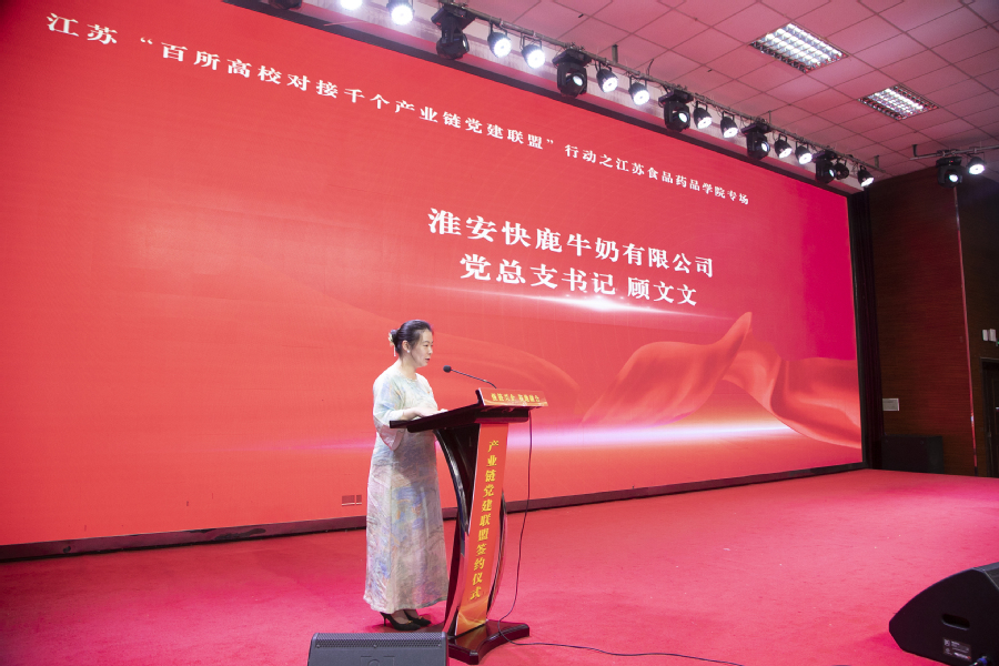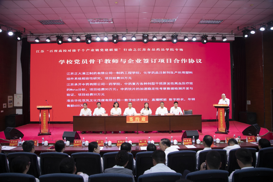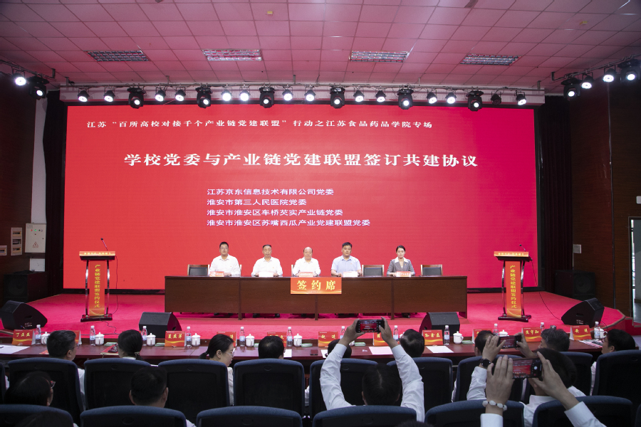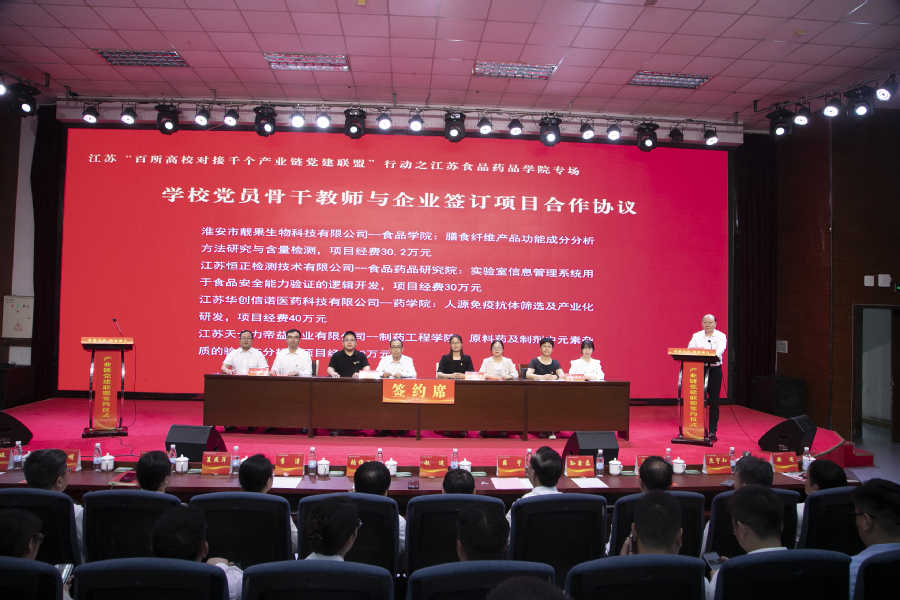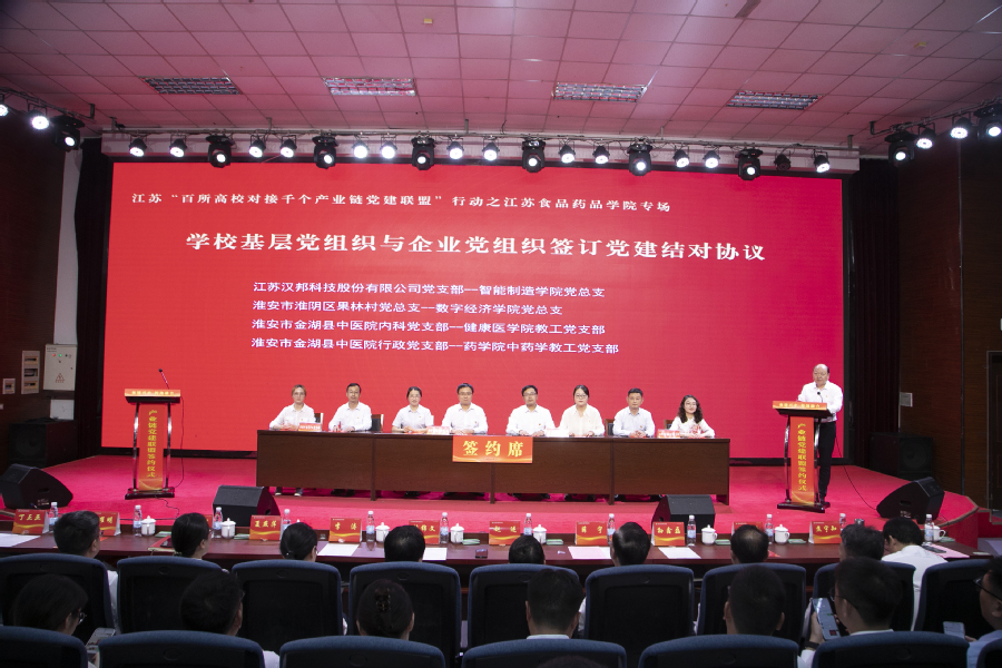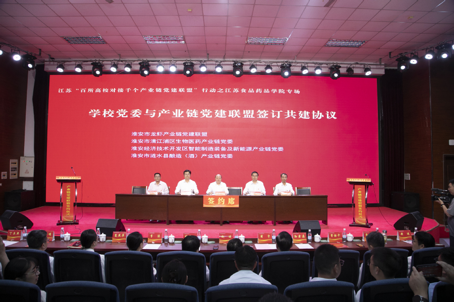 会上,学校党委与淮安市龙虾产业链党建联盟、淮安市清江浦区生物医药产业链党委等8家产业链党建联盟(党委)签订共建协议;学校基层党组织与淮安快鹿牛奶有限公司党总支、江苏今世缘酒业股份有限公司质量管理党支部、江苏正大清江制药有限公司车间党支部等12家企业党组织签订党建结对协议;党员骨干教师与淮安市靓果生物科技有限公司、江苏华创信诺医药科技有限公司等7家企业签订具体项目合作协议。