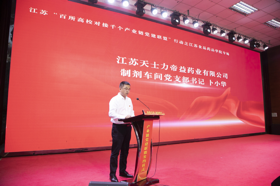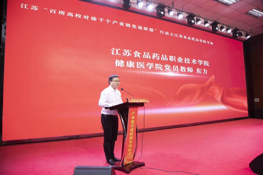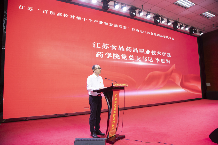 在举国上下热烈庆祝中国共产党成立103周年之际,为深入贯彻习近平总书记关于“江苏要在强链补链延链上展现新作为”重大要求,7月1日下午,我校在教学楼C115举行党建联盟签约暨“三链融合”工程启动仪式,全面启动江苏“百所高校对接千个产业链党建联盟”行动之江苏食品药品职业技术学院专场。淮安市委组织部副部长、市委党建办副主任赵进、省委教育工委组织处副处长张锦文、淮安市委组织部组织三处处长李涛、淮安经济技术开发区党群工作部企业工委书记孙金磊、全体校领导出席活动。仪式由校党委副书记安进主持。