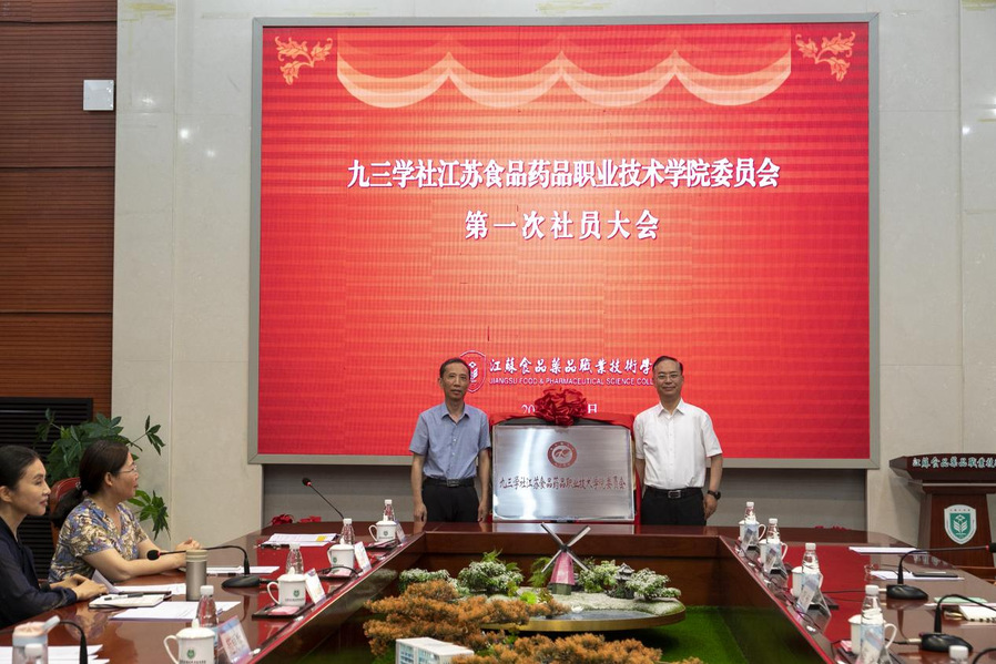 大会宣读了《九三学社江苏食品药品职业技术学院委员会成立筹备工作报告》和《关于同意召开九三学社江苏食品药品职业技术学院委员会第一次社员大会的批复》,选举产生了九三学社江苏食品药品职业技术学院第一届委员会。随后范更生和薛宇共同为“九三学社江苏食品药品职业技术学院委员会”揭牌。