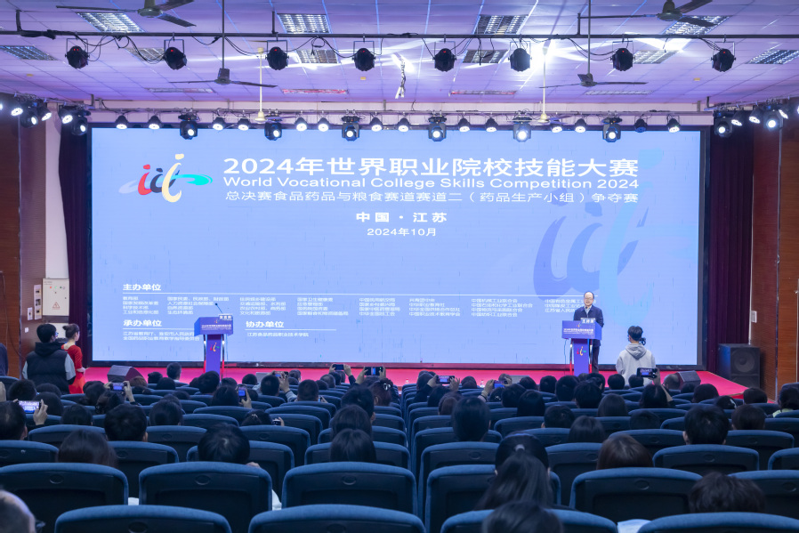 10月25日下午,2024年世界职业院校技能大赛总决赛食品药品与粮食赛道赛道二药品生产小组(赛项)争夺赛在我校启幕开赛。江苏省教育厅职业教育处副处长徐照民,江苏食品药品职业技术学院校长翟玮玮,裁判巡视员、江西工业贸易职业技术学院副校长胡晖,赛项裁判长、淮南联合大学科研处处长何晓文,赛项纪律监督组长、江苏食品药品职业技术学院纪委副书记李红,赛项纪律监督员、漳州科技职业学院老师张艳丽出席活动。大赛开幕式由我校制药工程学院院长陆正清主持。