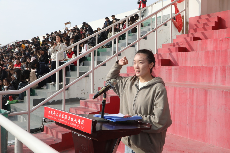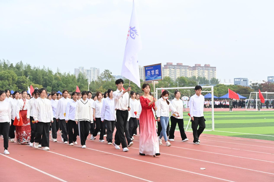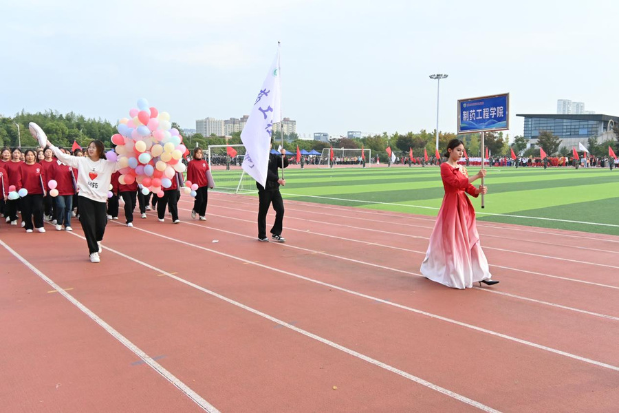 制药工程学院学子迈着坚定的步伐,充满活力地步入会场。他们身着统一的制服,在学院吉祥物“小志”的带领下,就像一颗颗明亮的星星,照亮了会场的每个角落。他们用整齐的步伐和响亮的口号,展示了团队的凝聚力和胜利的信心。