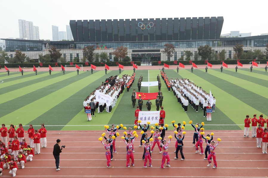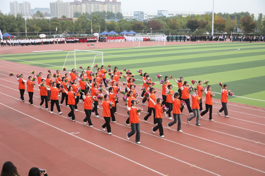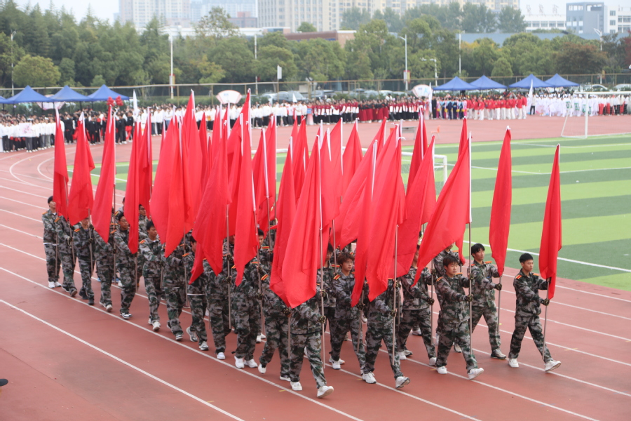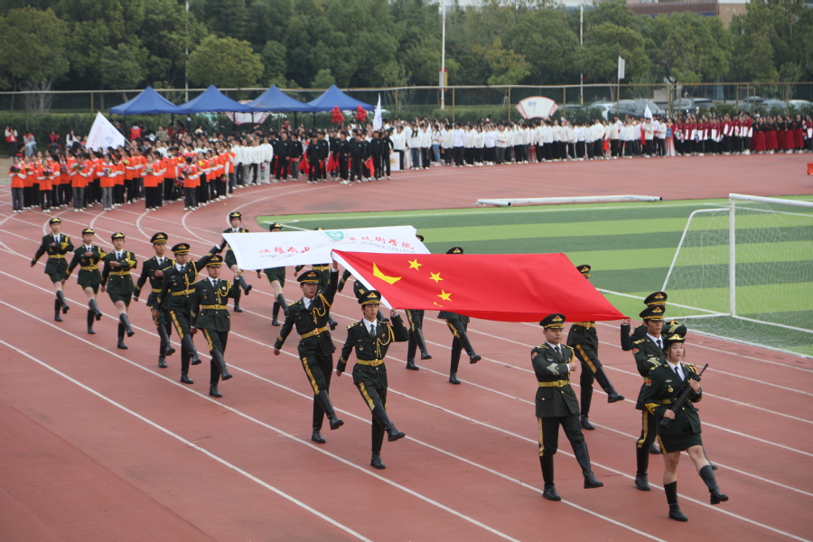开幕式上,国旗护卫队迈着铿锵有力的步伐走过主席台,接受全校检阅。校彩旗队、鲜花方阵以及各学院运动员方阵、教职工代表方阵依次入场。