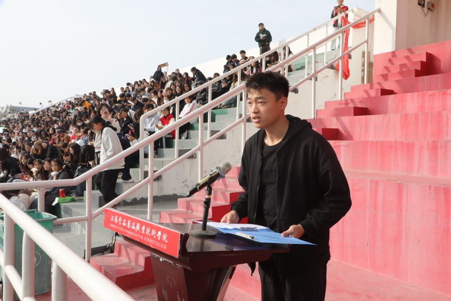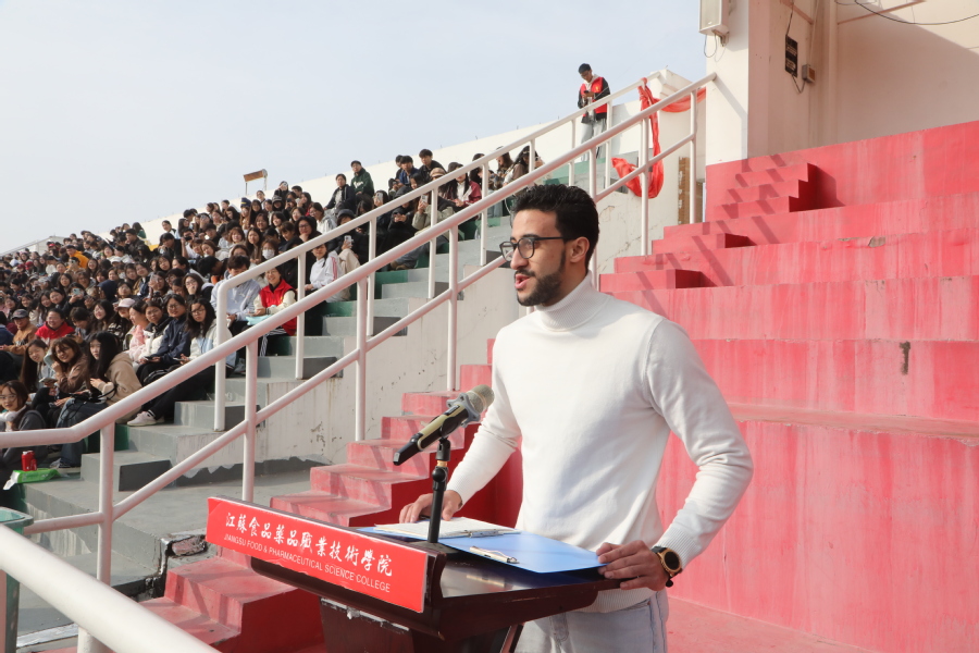徐静樨老师代表全体裁判员宣誓,健康医学院中医242班唐凯鹏同学代表全体运动员宣誓,来自摩洛哥国际电商231班苏礼代表留学生进行发言。