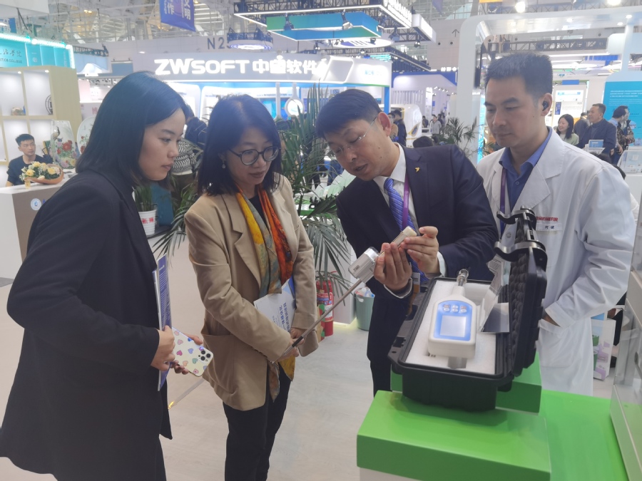 ▲何健为参观人员演示重金属分离富集仪的实际使用
