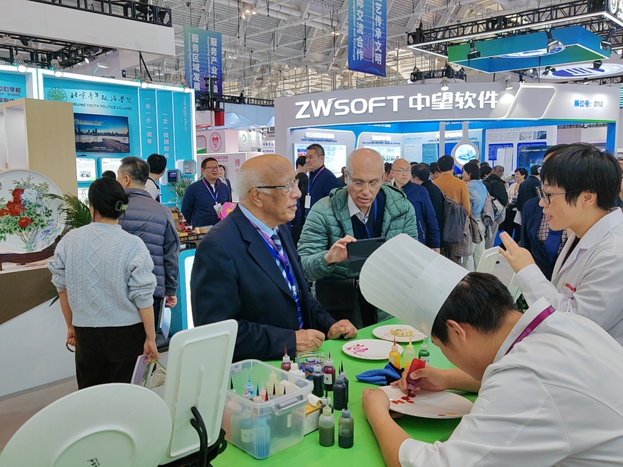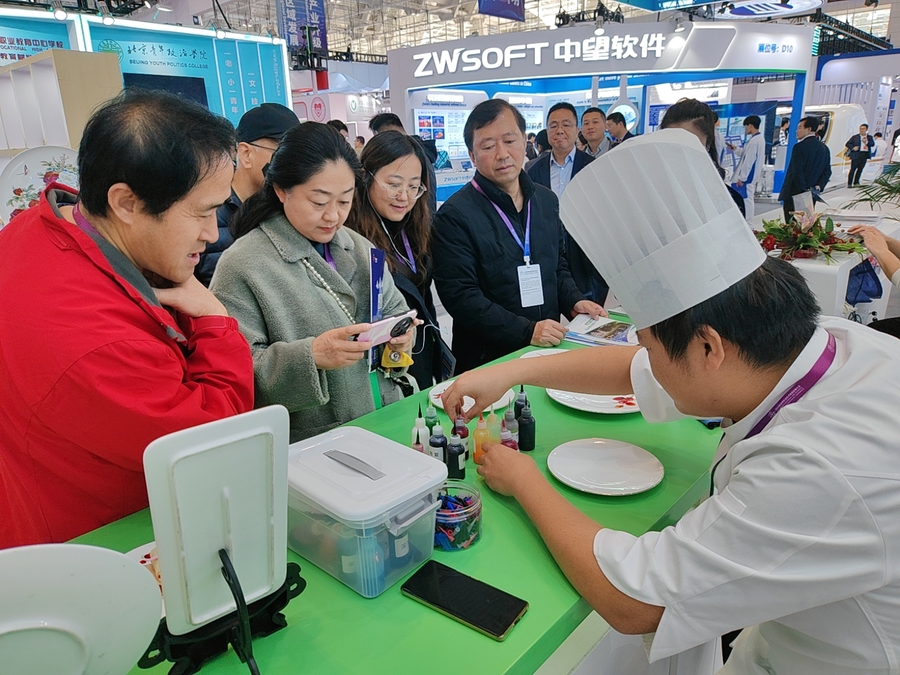我校成果在“服务区域发展”板块精彩亮相,展厅共分设三个展示区,分别为果酱画技艺演示区、产品区及设备区。果酱画技艺由我校酒店学院周干老师进行现场演示,技艺精绝,生动彰显苏食院独特的食蕴美学及食艺文化,吸引众多国际友人驻足认真观看,不时提问,还有人提出想要动手尝试作画,在周干老师的指导下,他们尝试描绘一些简单的形状,切身感受淮扬美食文化。