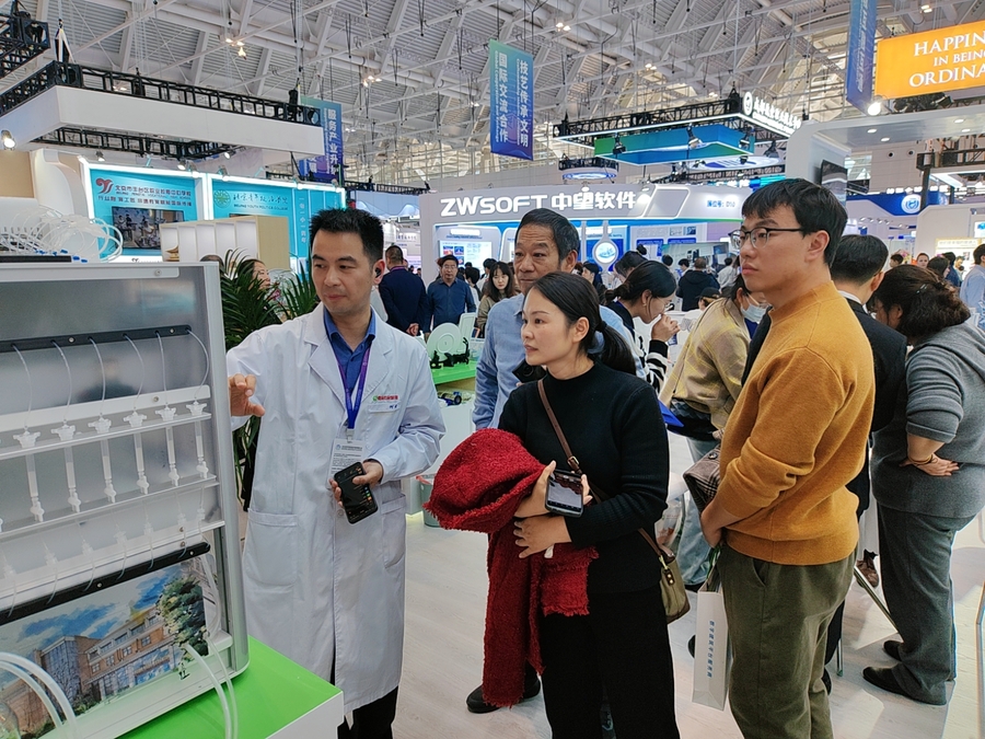 设备区展示了我校深化科教融汇、为区域食药行业质量安全保驾护航的最新成果。我校何健老师自主研发全自动重金属分离富集仪,为苏北地区绿色食品产业中小微科技型企业提供检验检测服务,牢牢保障人民的舌尖安全。我校瞄准白酒生产过程缺少在线监测设备的痛点,研发一系列白酒生产检测仪器,如PC01电子密度计、PC-04杆式介电分析仪等,解决传统摘酒误差较大、传统检测时间长,影响正常发酵等问题,并在泸州老窖黄舣基地、陕西西凤酒股份有限公司等多家企业试用验证。