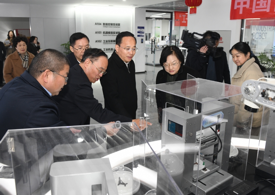 走进智能制造产业学院,顾坤市长特别关注产业学院在区域经济发展中发挥的优势与作用。学院负责人介绍了与淮安鹏鼎控股、淮钢特钢、威灵电机等区域龙头企业开展的现代学徒、订单式人才培养情况,以及对接江苏省1650产业体系和淮安市7+3先进制造业集群发展需求,为地方培养高素质技能型人才情况。