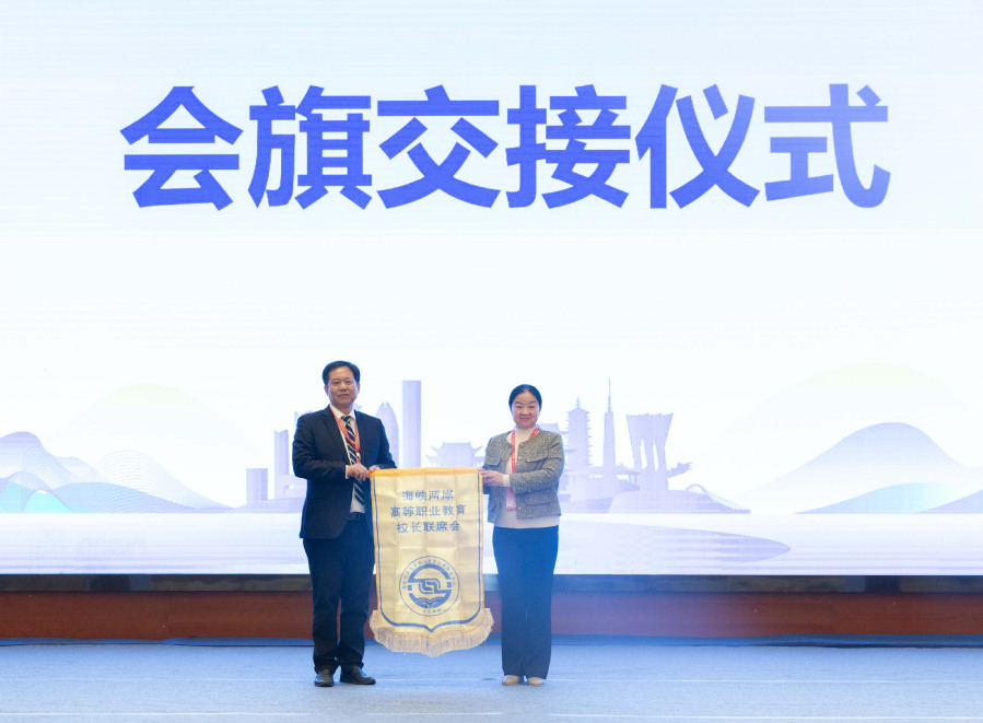 会议最后进行会旗交接仪式,下一届学术年会将由常州机电职业技术学院承办,苏台高职教育专家期待再次相聚、再叙友情。