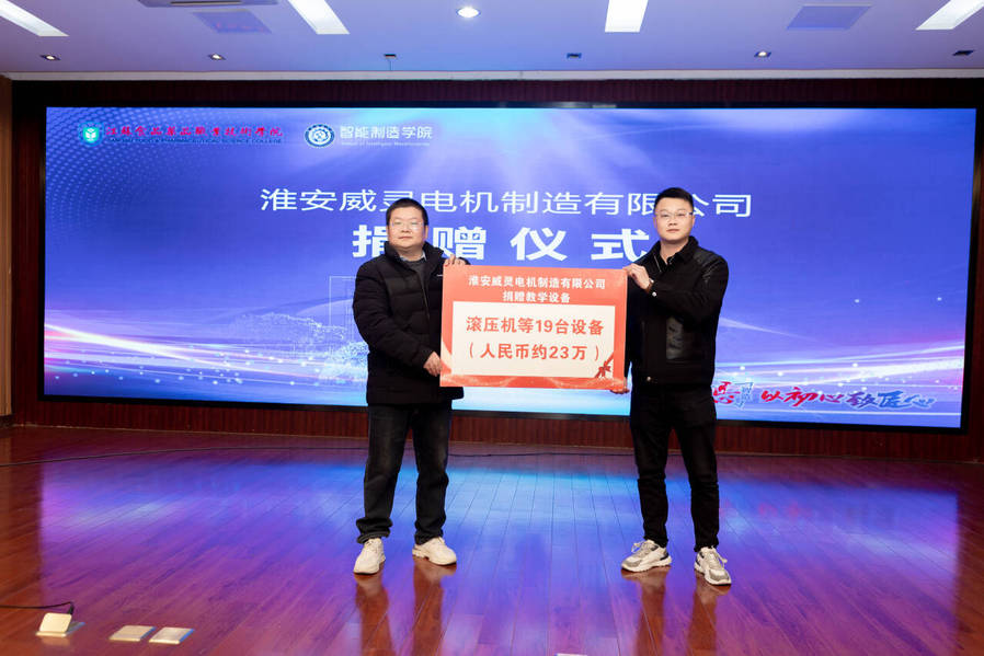 在之后的捐赠仪式中,淮安威灵电机制造有限公司智能制造部经理杨彬荣代表企业向我校智能制造学院捐赠滚压机、端子机、并绕机、充磁机各1台,电动机15台,总价值人民币约23万元。