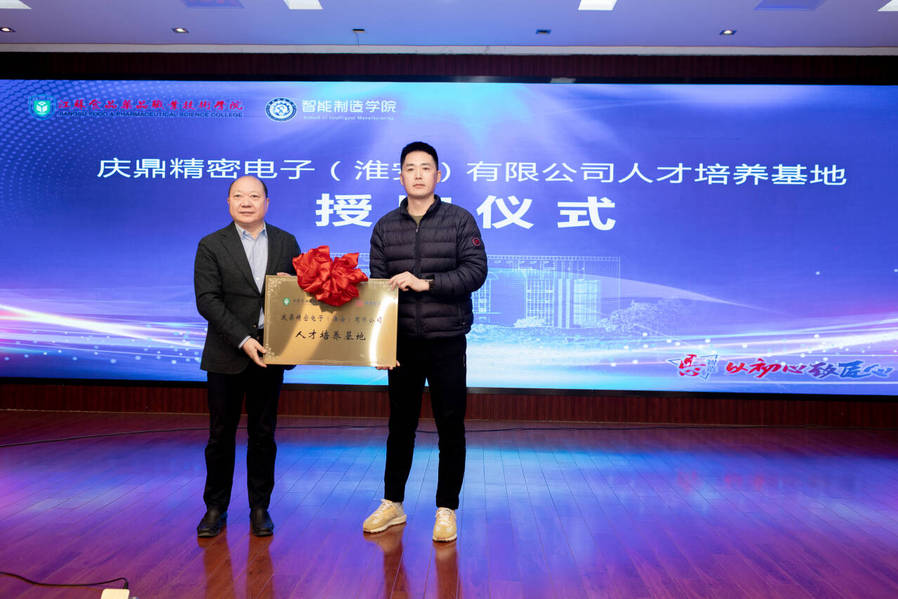 在“庆鼎精密电子(淮安)有限公司人才培养基地”授牌环节中,庆鼎人事部部长宋明代表企业向我校授牌。