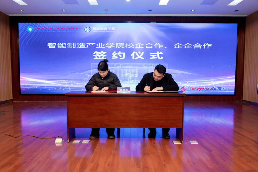 在学校副校长贾韶千宣布智能制造产业学院年会正式开幕后,江苏佑彩智能制造有限公司蒋虹总经理与淮安本地企业——淮安文泽宇实业有限公司、淮安市新鹏安全生产咨询有限公司共同签订合作协议,共同见证产业学院未来的持续发展。