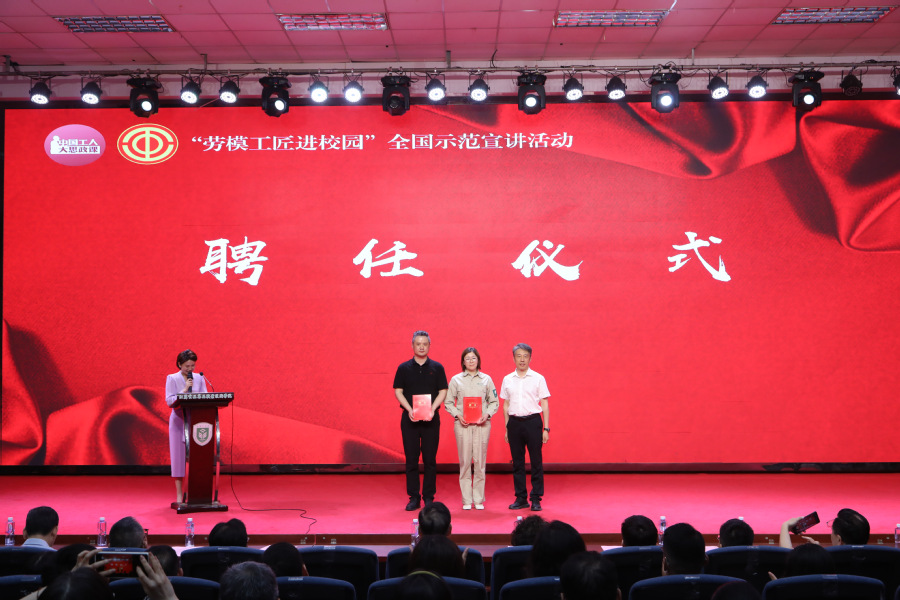 在“榜样立心”环节,全国劳动模范朱玉庭分享“从‘落榜生’到大国工匠”的感人故事,剖析自身从农民工到大国工匠的蜕变,靠的是心怀感恩、矢志不渝的奋斗,同时对毕业生们提出勤学不辍方能筑梦远航的殷切期望。全国劳动模范吉兰芳讲述“从中专生到创新能手”的追光之路。吉兰芳将自身成长经历凝练成“向下扎根,方能向上生长”“眼里有光,心里有爱,脚下有路”“独行快,众行远,美好生活需共同努力”三条人生感悟与同学们共勉。同学们怀着崇拜与热爱之情,向两位全国劳模现场提问,两位劳模均结合自身实践进行答疑解惑。最后,我校副校长贾韶千颁发聘书,特聘两位劳模为我校“劳模工匠兼职辅导员”。