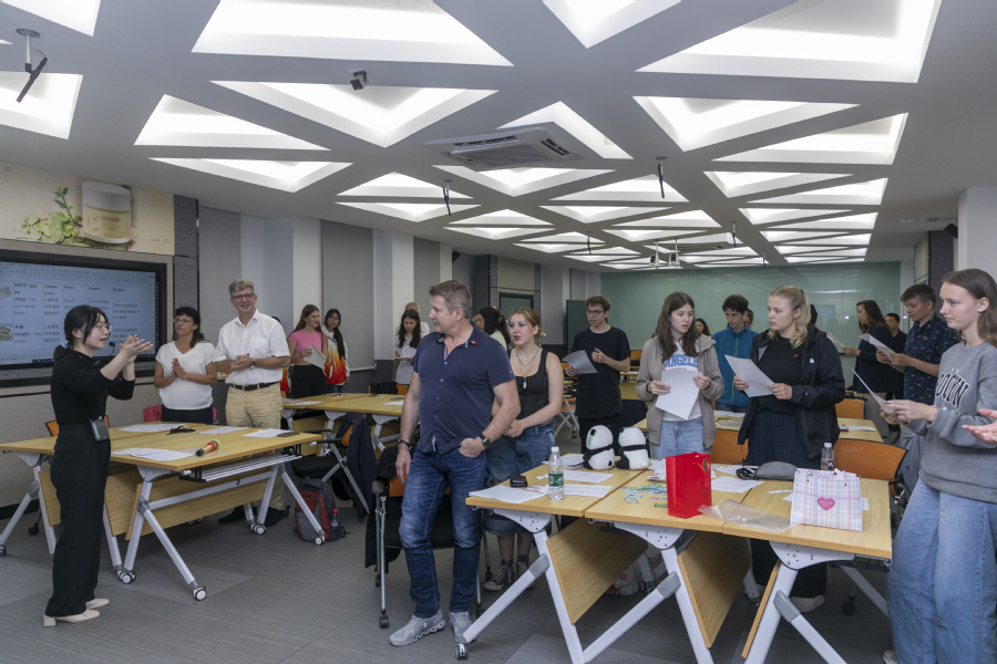 10月15日,国际教育学院老师为德国萨斯尼兹市代表团的青年学生们讲授了一堂别有生趣的汉语课,教他们学唱《幸福拍手歌》。德国的青年们积极参与,展现出对汉语学习的浓厚兴趣。