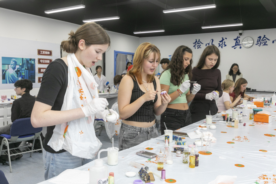 10月14日下午,德国萨斯尼兹市代表团参加了秋季药妆手作体验课程,在制药工程学院老师的指导下,亲手制作了唇膏和护手霜,他们纷纷表示这是一次难忘的经历。除此之外他们还体验了我校的中医养生保健课程,健康医学院教师带他们体验了香囊制作、中医诊断、推拿、拔罐、艾灸等中国特色养生方式,他们还品尝了中医养生茶饮,感叹中医传统文化的奇妙。