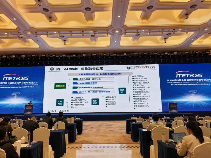 11月5日至7日,江苏省高等学校教育信息化研究会2025年学术年会在无锡召开,大会以“人工智能+高等教育融合创新发展”为主题。我校副校长焦宇知受邀参会,在上午校长高峰论坛与下午专家报告环节,结合学校实践分享思考,同时学习省内高校先进经验,为我校教育数字化建设汲取启发。
