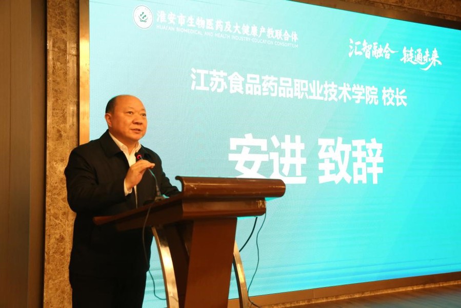大会由淮安市生物医药及大健康产教联合体秘书长、我校副校长焦宇知主持。我校校长安进教授首先致欢迎词,他表示,产教联合体的成立是响应国家产教融合战略的重要举措,更是服务淮安生物医药及大健康产业发展的现实需要。学校将以联合体为纽带,深化与政企单位的合作,聚焦人才培养供给侧与产业需求侧精准对接,打造特色鲜明、优势互补的产教融合生态体系,为产业发展输送高素质技术技能人才与创新成果。