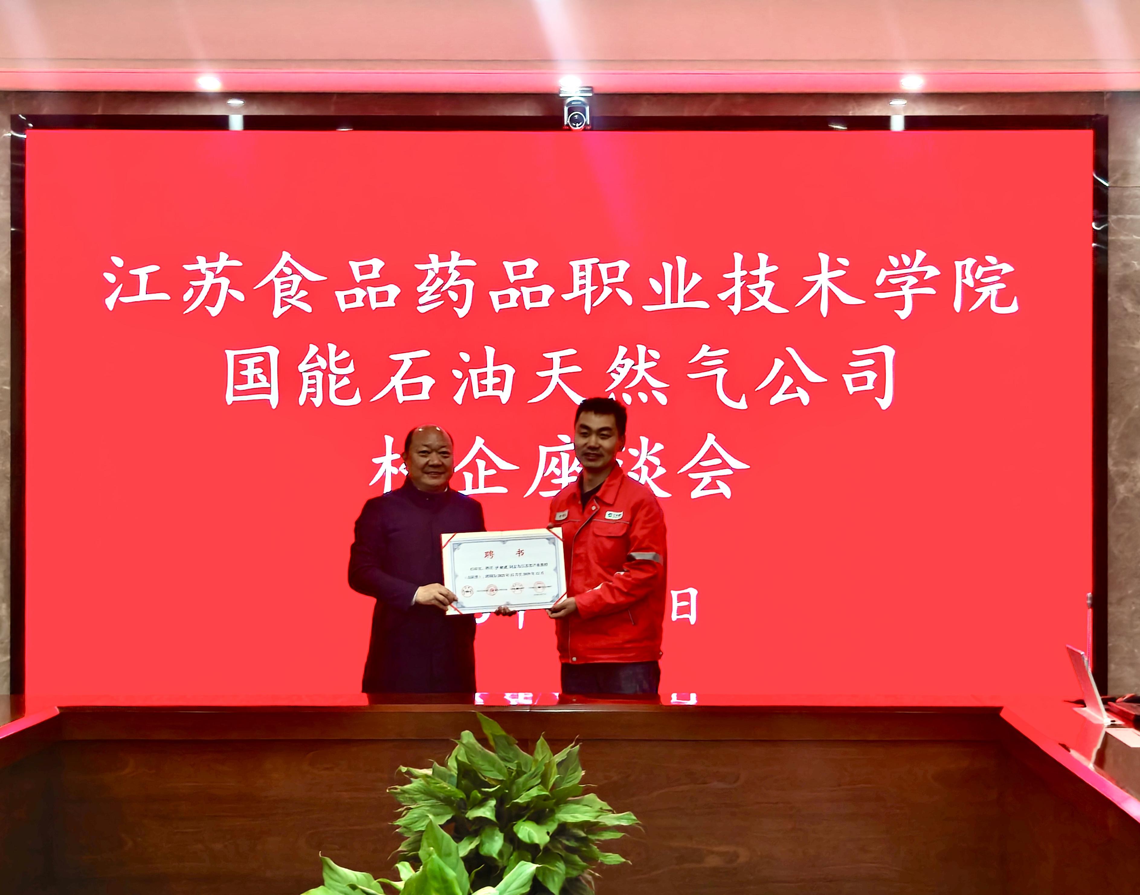座谈结束后,举行产业教授证书颁发仪式。安进为江苏国能石油天然气有限公司生产技术部主任工程师沙朝建颁发江苏省产业教授聘书,标志着校企师资共建、协同育人迈出坚实一步。