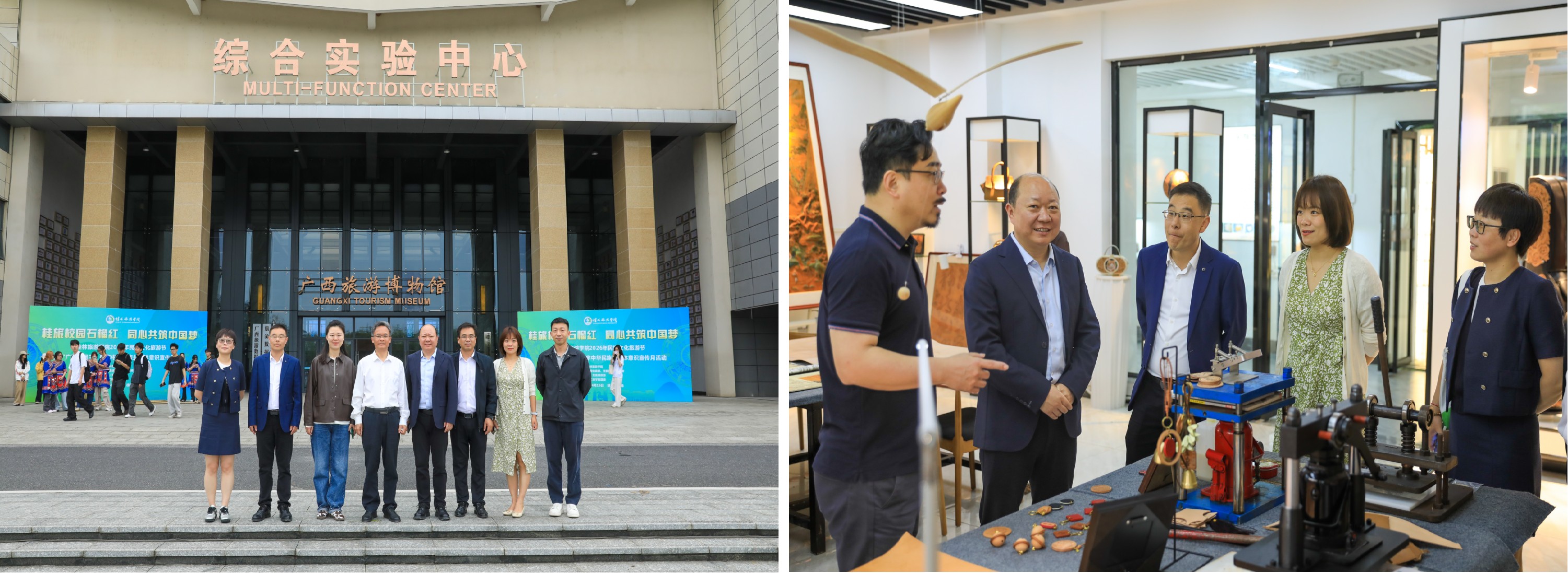 调研组赴桂林旅游学院专题学习产教融合综合实验中心建设机制,观摩了其智慧旅游综合实验中心全真化实操教学场景,在工艺美术专业实训基地陶艺、皮雕技能大师工作室交流了高层次人才团队招引经验,还在座谈中学习了该校全真运营国际酒店“教学保障为先、运营动态辅助”的双轨运行机制。该校林春逸校长高度赞扬了我校大健康办学理念,表示希望能与我校加深合作,培养文旅康养相结合的现代旅游人才。